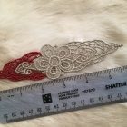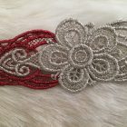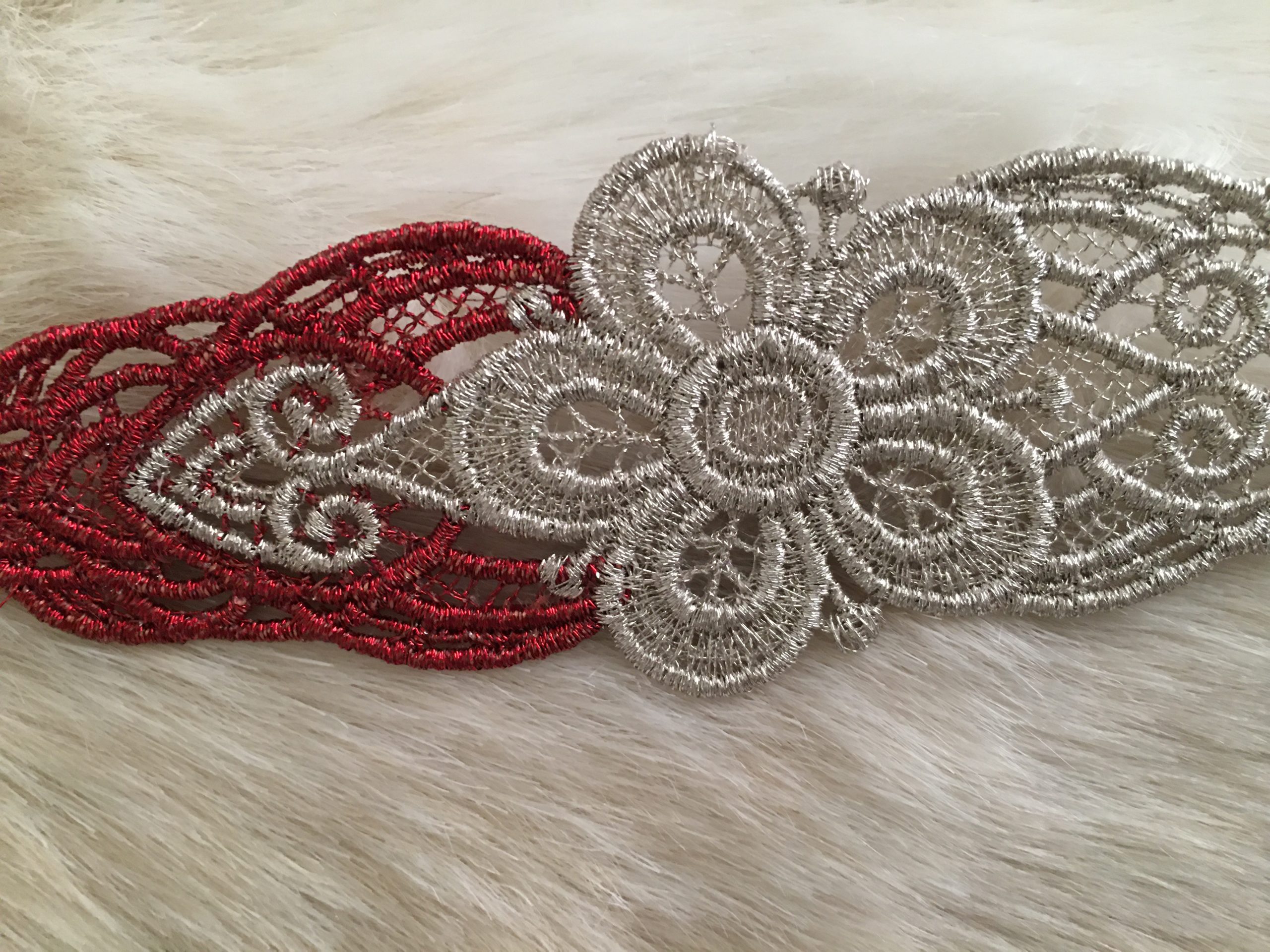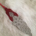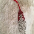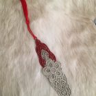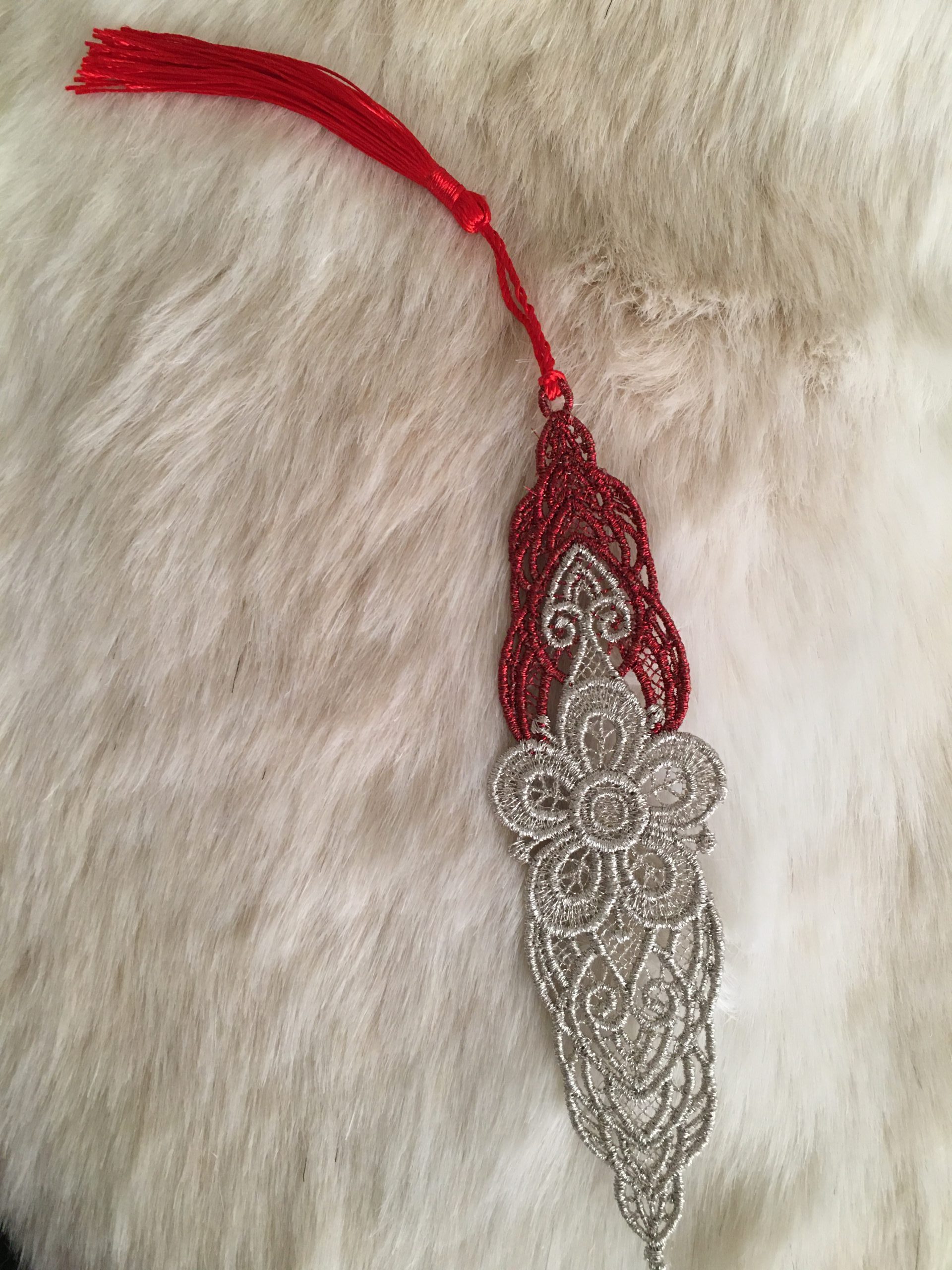A delicate yet durable design, stitched in shimmering red and silver metallic threads and finished with a matching red tassel. This bookmark is elegant, lightweight, and perfect for marking your place in style, or for a gift for that special friend.