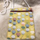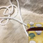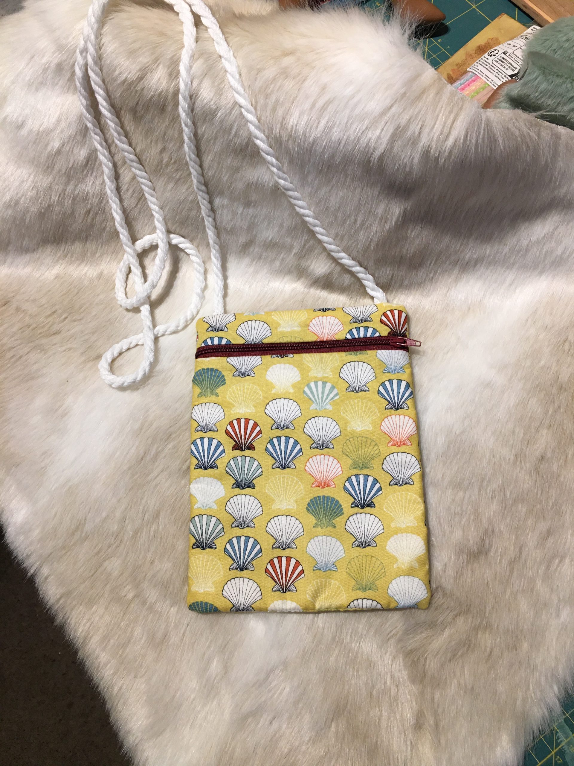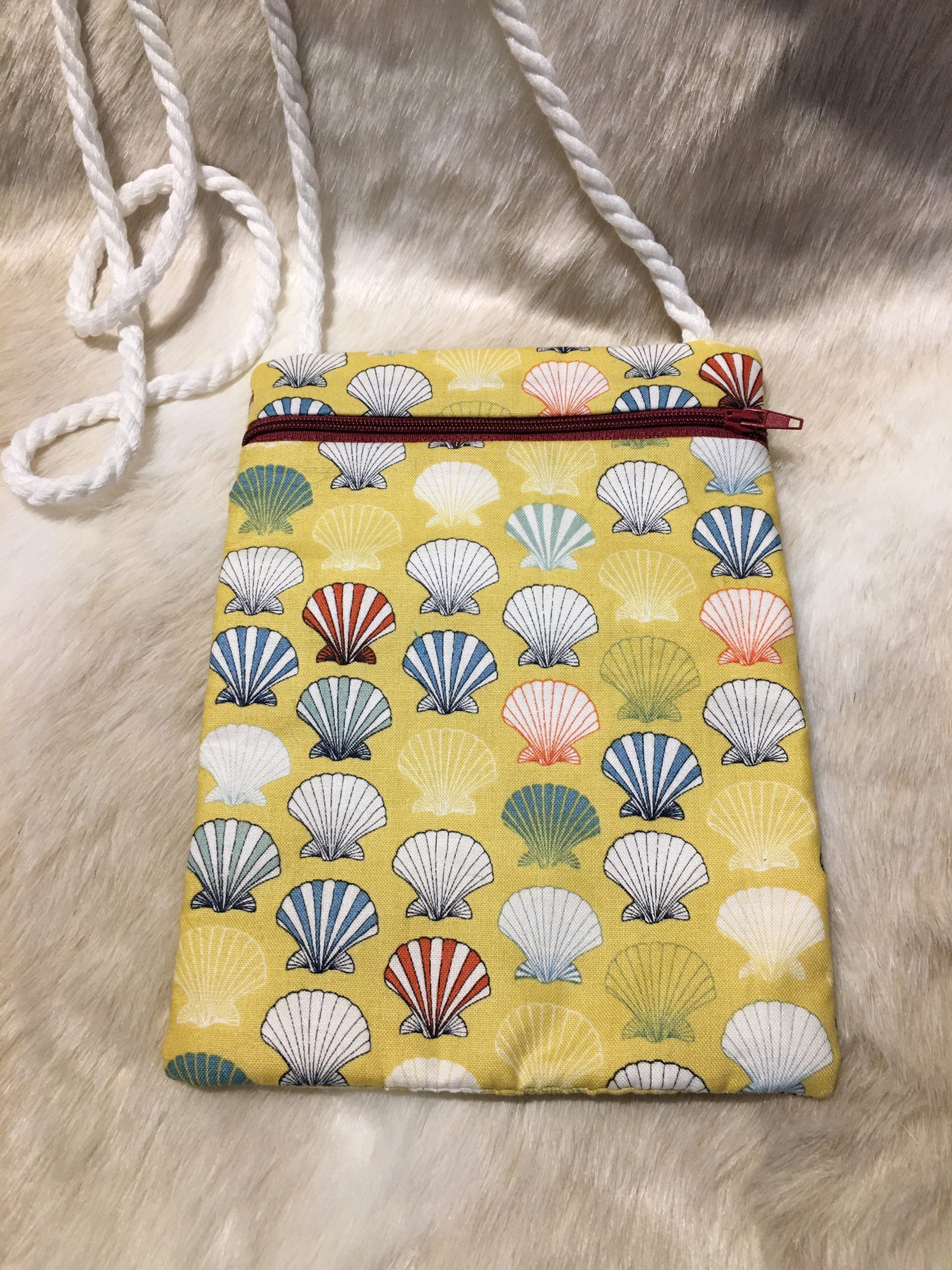 A lightweight, cross body/shoulder  bag.  This pretty seashell bag has  a rope strap which  is approx. 36′ long, making it hang at 18″ – just about hip height.